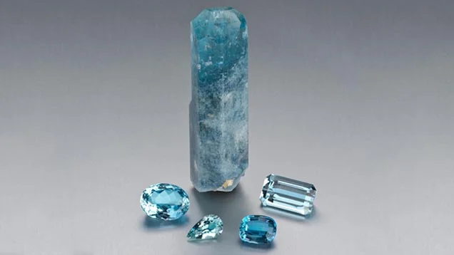 Aquamarine is in the beryl group of minerals. The most valuable and most well-known beryl mineral is emerald, and though these two gemstones share a similar chemical composition, their characteristics are very different. Emerald’s brilliant green color is due to chromium and vanadium, while aquamarine gets its blue to green-blue color from iron impurities. Its famous sea-blue tones can range in intensity from a pale light blue to dark-blue, which is the most sought after and valuable aquamarine color.
